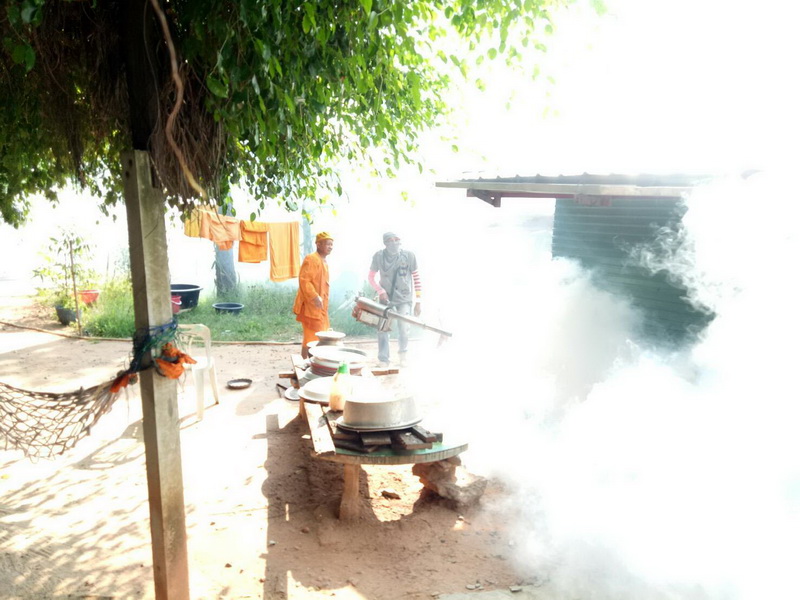 องค์การบริหารส่วนตำบลสามเมืองออกพ่นหมอกควันเพื่อป้องกันและควบคุมโรคไข้เลือดออก ที่วัดบ้านสามเมือง หมู่ที่ 2